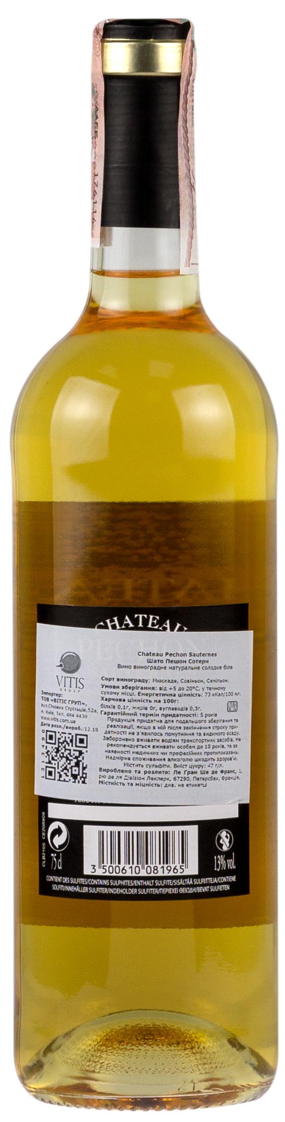 Шато Пешон находится в Сотерне, к востоку от города Бордо. В Сотерн входят 5 муниципалитетов: Барсак, Бомм, Фарг, Преньяк и Сотерн, все они находятся на левом берегу реки Гаронна. Площадь виноградников Сотерна – 2000 га. Всего в регионе 240 производителей. Аппелласьон пересекается с обеих сторон рекой Сирон, что способствует развитию благородной плесени Botrytis на винограде. Эта местность известна своими престижными винами, признанными во всем мире, как Yquem или Climens.